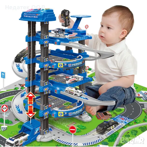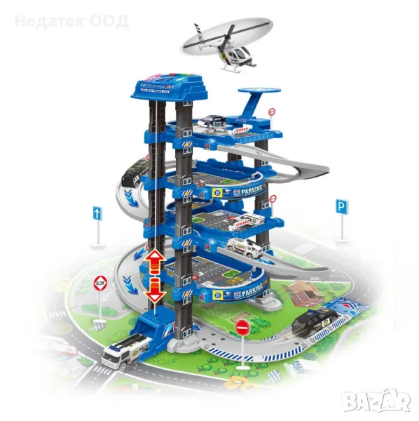 Полицейски гараж с 3 нива, изход за превозни средства, който променя цвета си в 2 от тях, 78x58cm килим с писти, пътна сигнализация и самолет (25x27x8.5cm), чийто нос се отваря, за да побере превозните средства. В горната част на гаража има полицейски светлини и звуци. Работи с 3 AA батерии (не са включени).