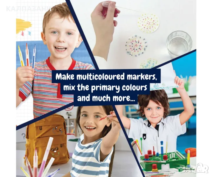 бичате ли да рисувате и да развихрите въображението си? Имаме идеалния игрален комплект за вас: Science4you Забавна фабрика за маркери. Със Science4you Забавна фабрика за маркери можете да научите как да правите свои собствени маркери. Разбери как да създаваш многоцветни, ароматизирани и дори невидими маркери! Можете също така да научите как да правите химикалки, които променят цвета, миризмата си и правят невидимо мастило. Научете се да смесвате цветове и изследвайте всички възможности на тази фабрика за цветове! Можете също да създадете и персонализирате своя собствена кутия с маркери. Създавайте нови цветове и изследвайте всички възможности на Забавна фабрика за маркер от Science4you. Този комплект включва 65 части и 12 супер забавни дейности.