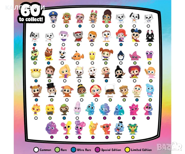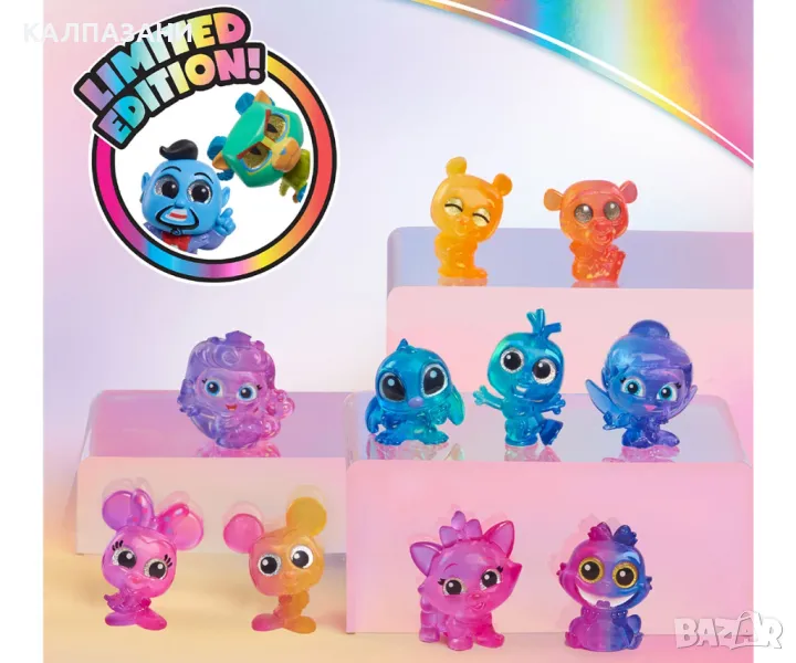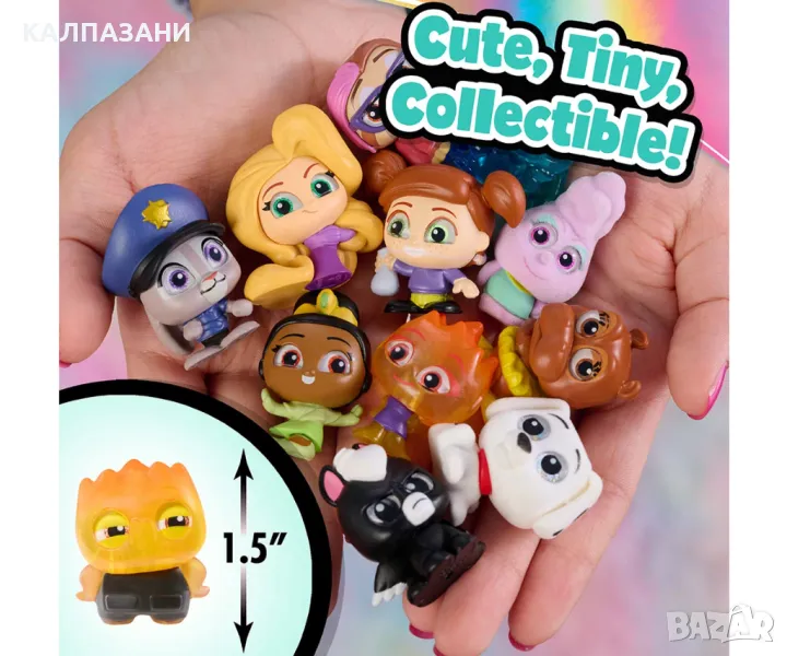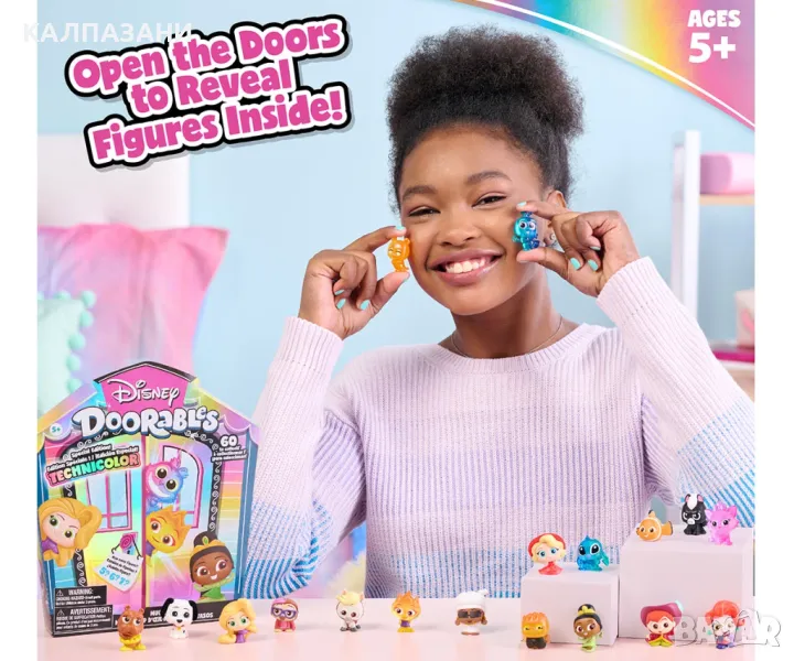 Зад всяка врата ви очаква изненада с колекционерските фигурки Disney Doorables Technicolor Takeover. Отворете пликчето, за да намерите 1 колекционерска фигурка от анимационните филми на Disney и Pixar. Тази серия включва 50 герои, плюс 10 специални издания Technicolor Takeover – Disney Рапунцел, Мари, Гъсеницата, Стич, Олаф, Тинкърбел, Мини Маус, Мики Маус, Пух и Тигър – с омбре покритие. Открийте фигурки на Doorables, които не са били представяни досега, от историите на Disney за Питър Пан, Зоотрополис, Фантазия, Спасителите и много други. Търсете пухкави фигурки от Disney’s 101 далматинци, перлени прозрачни фигурки от Disney и Pixar’s Elemental, както и ограничената серия Пепита и Джини като водещ на игрите. Всяка фигурка на Doorables е с височина около 4 см и разполага със стилизирани детайли с искрящи очи. Колекционерските играчки Doorables са забавни за събиране и споделяне. Те са отлични изненади за рожден ден и всякакви поводи за феновете на Disney и деца на възраст 5 години и нагоре.