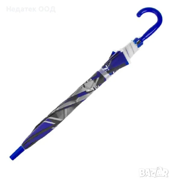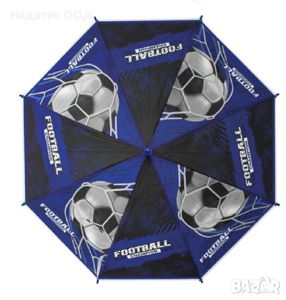 Момчешки чадър за дъжд в син цвят с футболен дизайн. Има синя дръжка с извит захват и механизъм за автоматично отваряне.