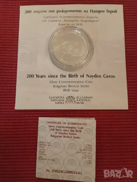 Сребърна юбилейна монета,10 лева, 200 години от рождението на Найден Геров. , снимка 1 - Нумизматика и бонистика - 49125858 Сребърна юбилейна монета,10 лева, 200 години от рождението на Найден Геров. , снимка 2 - Нумизматика и бонистика - 49125858 Сребърна юбилейна монета,10 лева, 200 години от рождението на Найден Геров. , снимка 3 - Нумизматика и бонистика - 49125858 1/3