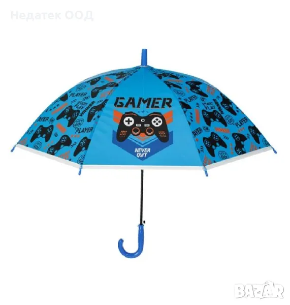 POE чадър за дъжд за момчета в син цвят с геймърски дизайн. Има извита дръжка и механизъм за автоматично отваряне.