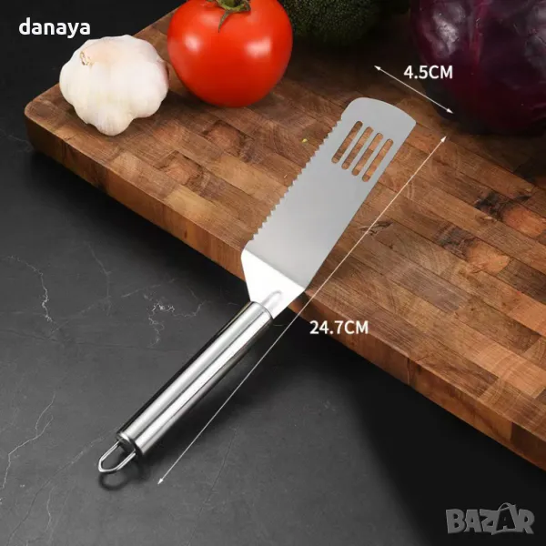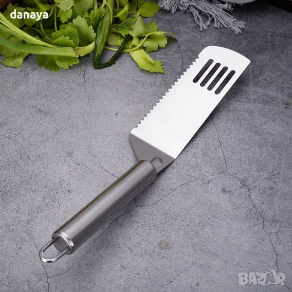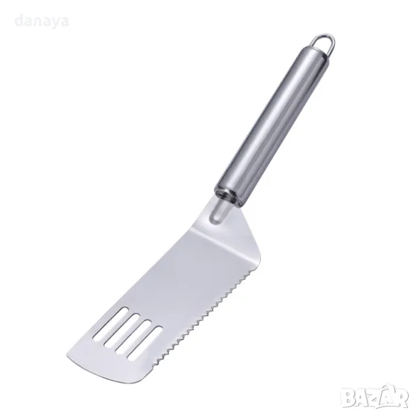 Тази кухненска лопатка е незаменим помощник за всеки любител на сладките изкушения! С назъбен ръб от едната страна, тя реже лесно торти, пайове и сладкиши, пици, а гладката затъпена страна гарантира перфектно сервиране, без да нарушава формата на парчетата.