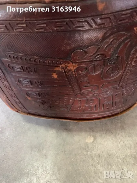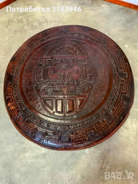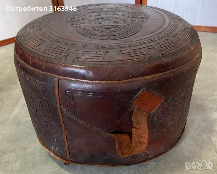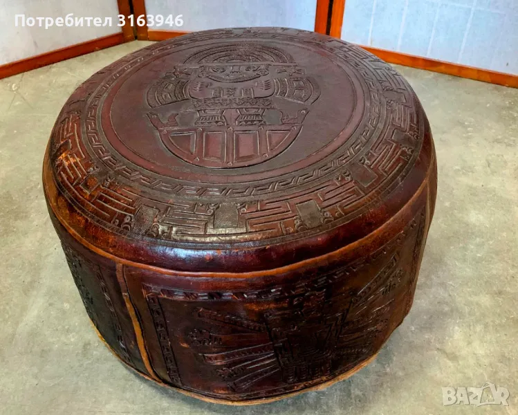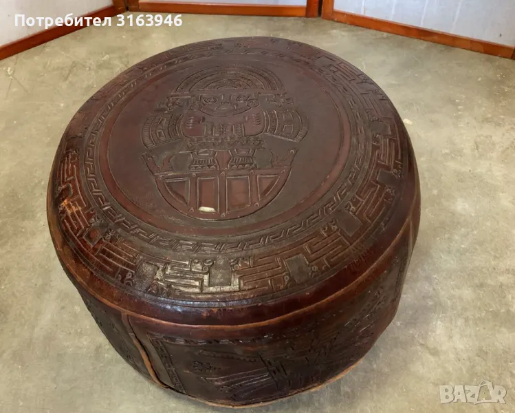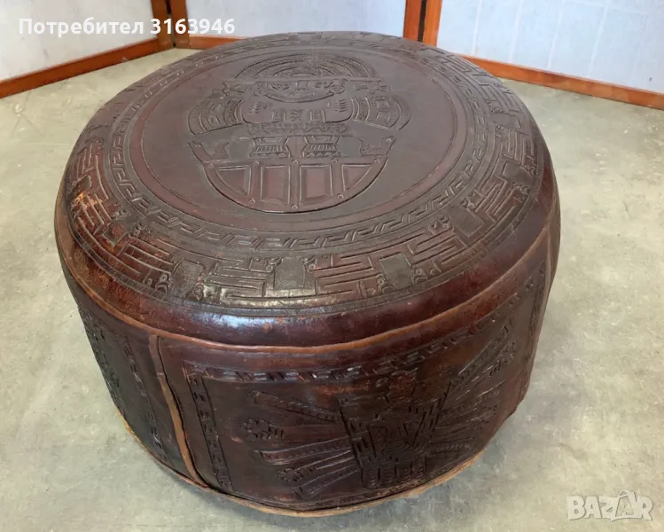 Табуретката не е просто място за сядане, а ефектен декоративен елемент. Подробните резби върху кожата включват изображения на предколумбови символи и фигури, които предлагат както исторически резонанс, така и визуална интрига.