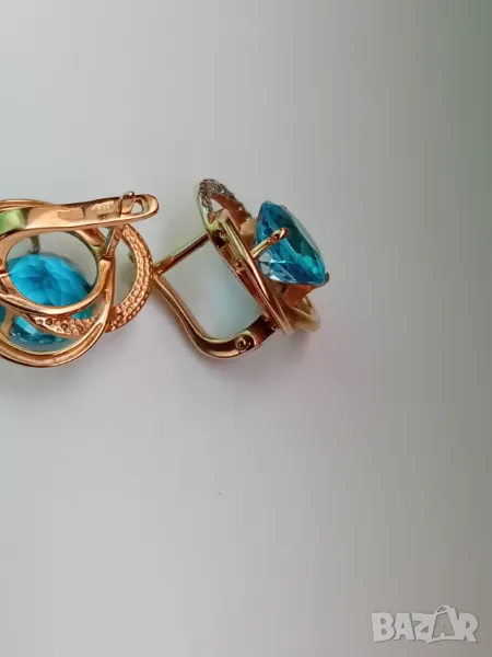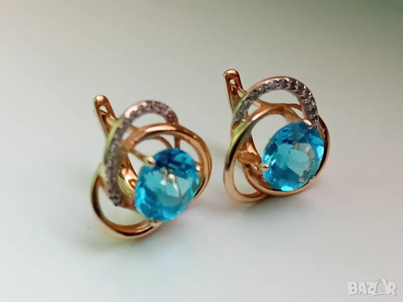 Разкошни големи обеци.В състояние като за подарък. Розово злато 585 с тегло 4 ,31 грама със сини топази Swiss blue .Закопчаването е стабилно.Крайна цена.