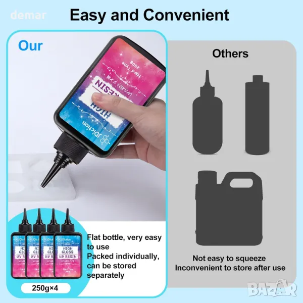 Силно лъскава UV смола с прозрачно, полирано покритие, идеална за начинаещи и за занаяти „Направи си сам“. Има слаба миризма за по-приятно изживяване при изработка. Втвърдява без лепкавост, предлагайки гладка, издръжлива и устойчива на надраскване повърхност с твърдост 80D. Проектиран с подобрени UV инхибитори, за да устои на пожълтяване, осигурявайки дълготрайна чистота и блясък.
