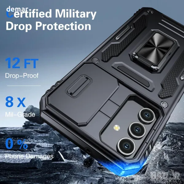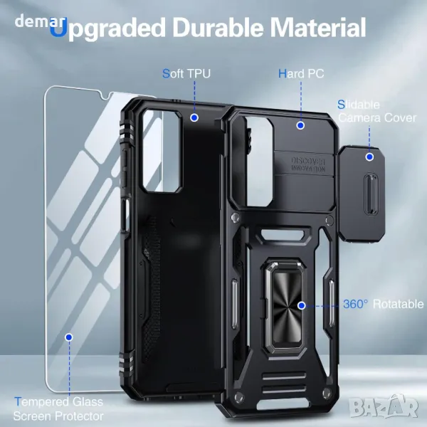 Проектиран за Samsung Galaxy A15 6,5-инча, този калъф предлага прецизни изрези за пълен достъп до портове и бутони. Включва PET HD протектор за екран за допълнителна защита на дисплея. Създаден със здрав гръб за компютър и ударопоглъщащи брони от TPU, той осигурява военна защита срещу падане срещу удари. Плъзгащ се капак на обектива предпазва камерата, без да влияе върху качеството на снимките. Въртящата се на 360° метална пръстеновидна стойка позволява гледане без ръце и поддържа магнитни стойки за кола за допълнително удобство.
