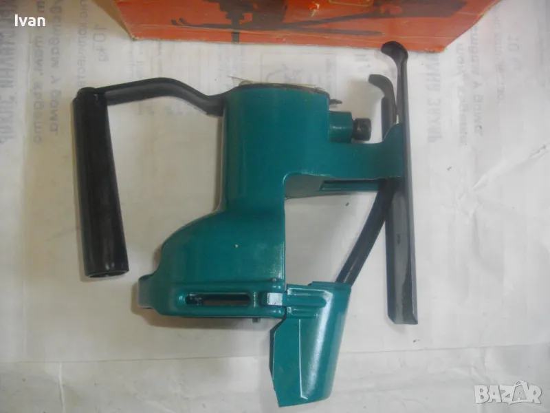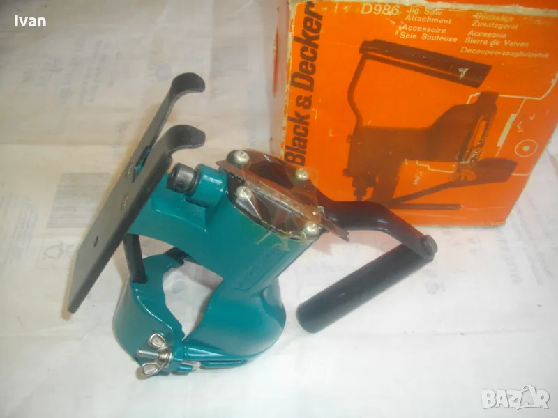 Описание на оригинална синя френска приставка зеге - вертикален прободен трион Блек Декер за бормашина на марката. Съвсем нова приставка зеге-вертикален прободен трион,професионален модел на Блек Декер.Приставката е за бормашини-дрелки на марката Блек декер,старите оригинални модели-сините и оранжеви 300-550 ватови.Приставката е оригинално френско производство.Марка и модел-Black Decker D986.Приставката е професионална,изцяло масивна,желязно,висококачествена изработка.Глава-стандартна,за ключ шестограм-малък.Захват-стандартен,за стандартни ножчета-триони с U образен захват.На приставката има поставен нов оригинален режещ нож-трион за дърво,Шведско оригинално производство,марка Wolfcraft.Приставката е с масивна удобна желязна дръжка,с пластмасово нехлъзгащо се покритие.Приставката е прибрана в оригиналната си френска картонена опаковка.