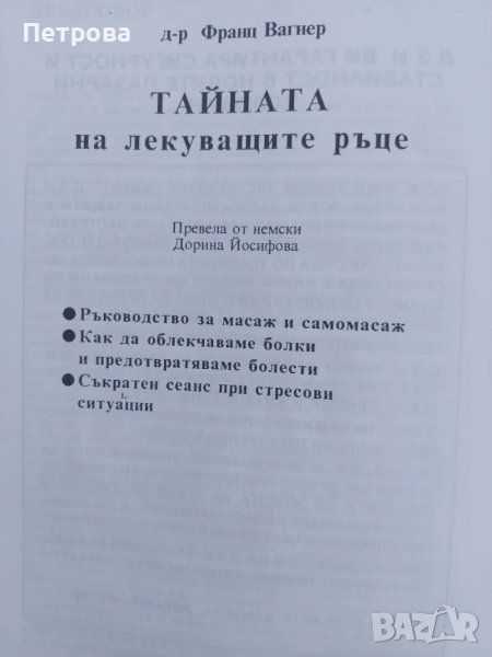 Тайната на лекуващите ръце. От поредицата Здраве. Помогни си сам. Автор д-р Франц Вагнер, високоерудиран специалист по медицинска социологиа, философия и природни лечебни методи. Ръководство за масаж и самомасаж. Как да облекчаваме болки и предотвратяваме болести. Съдържанието би представлявало интерес и за определена част от лекарското съсловие – физиотерапевти, невролози, психиатри и др. предвид споделения опит в тази интересна, дискутирана, но все още за мнозина имагинерна терапия. Книгата е богато илюстрирана с указателни фигури и схеми. 80 стр. Нова, неизползвана. Цена 14 лв. Изпраща се с 10% отстъпка от общоприетата куриерска такса.