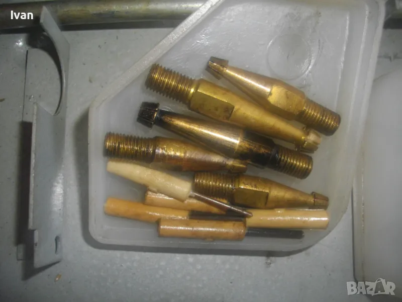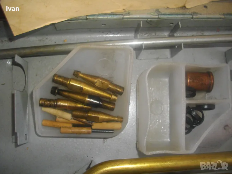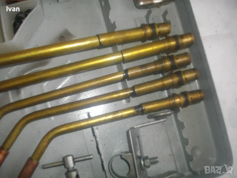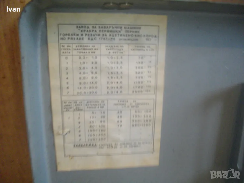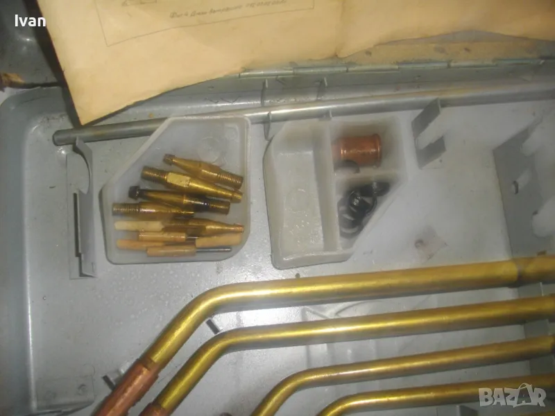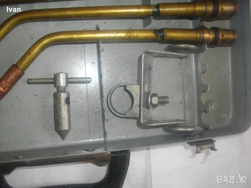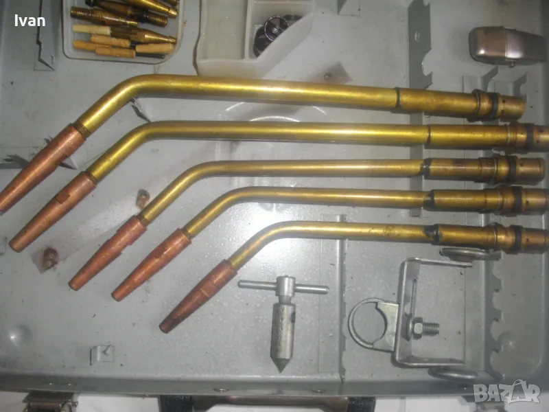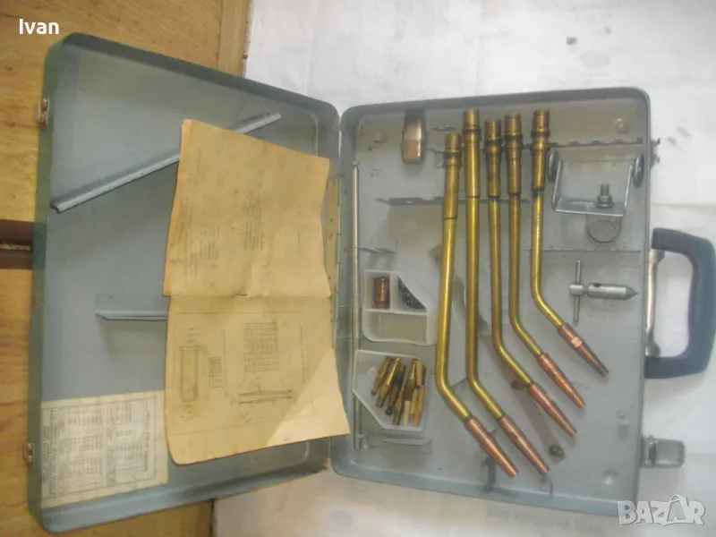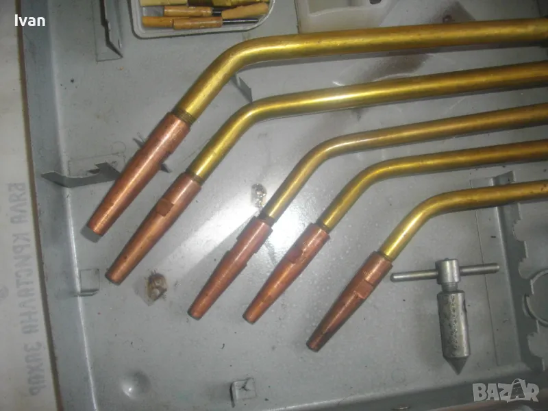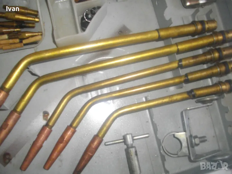 Включва 5 броя горелки оригинални с оригиналните контактни дюзи с номера №3, №4, №5, №6, №7. /без номер 0 и номер 1, които са продадени отделно/. В комплекта са налични още оригиналния пергел и колесар за придвижване бренер. В оригиналната пластмасова бяла кутийка са налични голямата дюза за резак, 5 бр. дюзи за резак резач Кракра, 5 броя оригинални гумени уплътнения като консуматив за бренер. Наличен е и паспорта техническа документация на комплекта горелки и дюзи за Кракра: "Комплектна придружителна документация оксиженови горелки и резачи за ацетилено-кислородно рязане и заваряне ежекторен тип." гр. Перник 1976 г. Завод за заваръчни машини "КРАКРА"-гр.Перник. Комплектът е производство по паспорт 1978 г. и е прибран в оригиналния си метален куфар на марката, който е с една извадена копчалка, която е налична вътре в куфара.