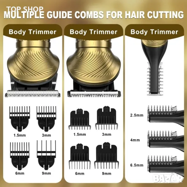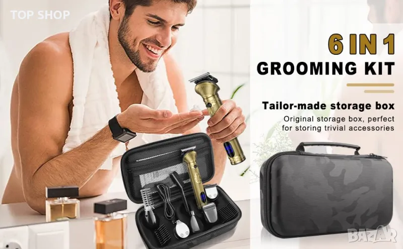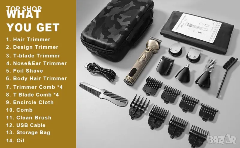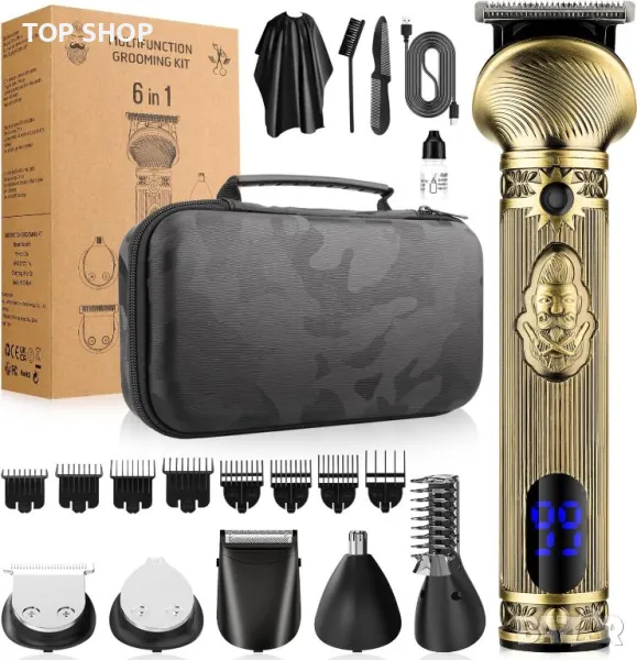 МУЛТИФУНКЦИОНАЛЕН КОМПЛЕКТ ЗА Подстригване и стилизиране 6 В 1 - Прецизен дизайн на системата за бръснене, 6 глави за подстригване за всичките ви нужди от подстригване и идеални за всички стилове на коса: машинка за подстригване, прецизна машинка за подстригване, машина за подстригване на косми в носа, машина за подстригване на брада, фолио за подстригване и машинки за подстригване на тялото. Мъжкият комплект за подстригване е снабден с 8 гребена с приставка и 1 гребен, 1 склад, 1 масло, 1 наметало, 1 чиста четка. Този комплект съдържа всичко необходимо за подстригване и подстригване, за да постигнете професионални резултати у дома