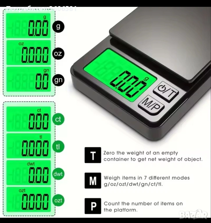 5: 7 различни единици за тегло: g/gn/ct/tl/dwtt/ozt/oz. Отличен инструмент за измерване на различни предмети като храна, скъпоценни камъни, диаманти, стрели, прахове, билки и бижута.