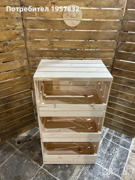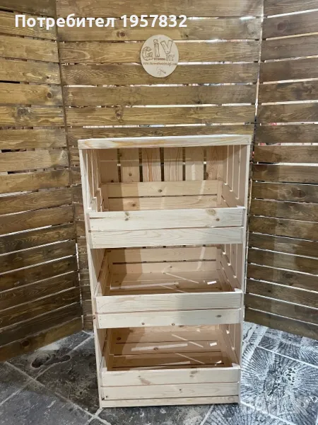 Стелажът е изработен ръчно от първокачествен дървен материал. Изключително здрава сглобка. Стелажът е подходящ за плод и зеленчук и всичко останало, по Ваш избор.