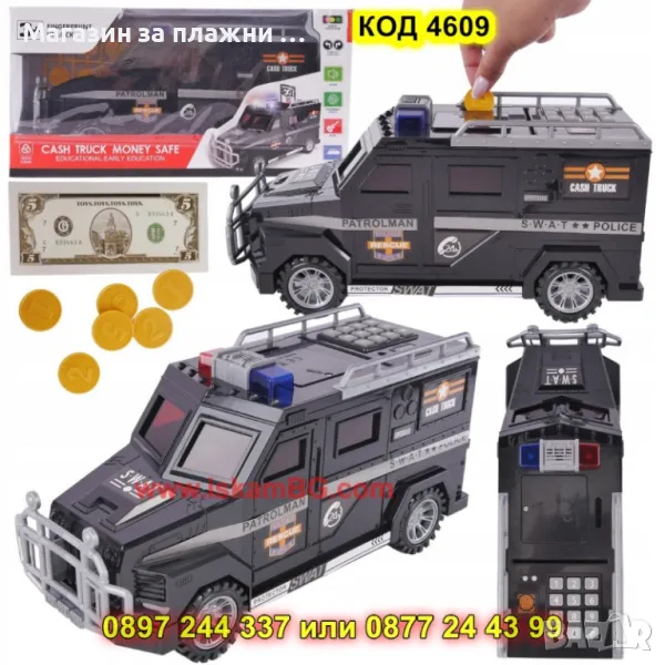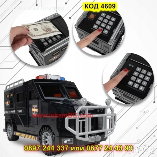 ЗА МОНЕТИ И БАНКНОТИ - полицейска кола, касичка може да съхранява както монети (специална дупка в покрива за монети), така и цели банкноти, които приготвят автоматично, когато се приближите до покривната част. Полицейската касичка има голямо помещение за съхранение, така че лесно може да побере голяма сума пари.