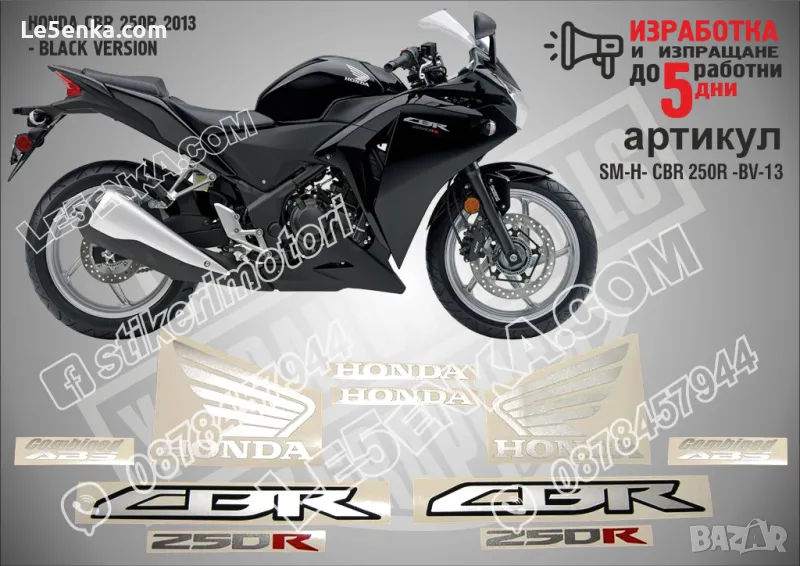 Комплект стикери за ребрандиране наHonda CBR 250R - 2013 Red Version.Стикерите се изработват от автомобилно кът фолио и са подготвени за монтаж, като представляват реплики на оригиналните стикери.