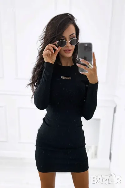 Тази мини рокля с оребрена кройка и дълъг ръкав е перфектният избор за топлите есенни дни. Вталената ѝ кройка перфектно подчертава силуета и фино подчертава краката. Златната кръпка в центъра добавя елегантен щрих, създавайки уникален, привличащ вниманието детайл.