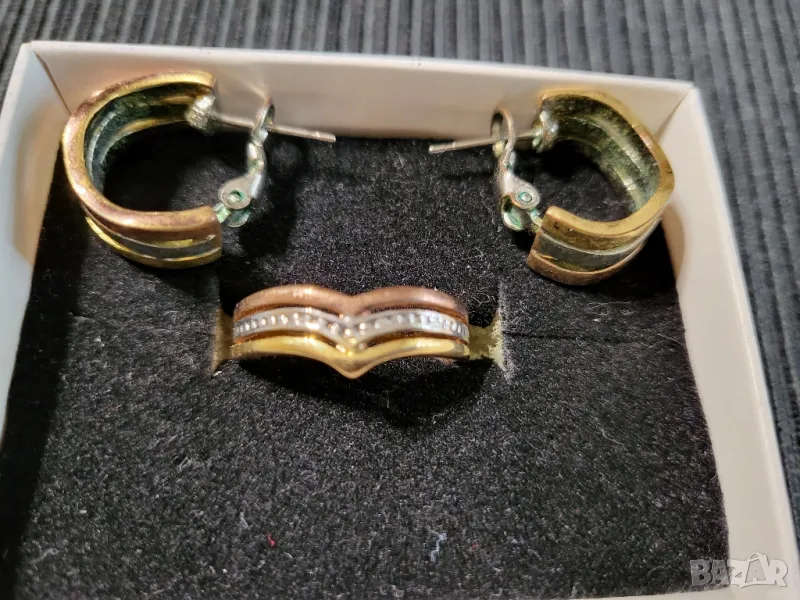 Комплект трицветни обеци и пръстен от мед стомана. Обеците са с диаметър 16 мм и са с английско закопчаване. Пръстена е с вътрешен диаметър около 17мм. Отлично състояние.