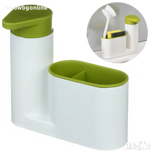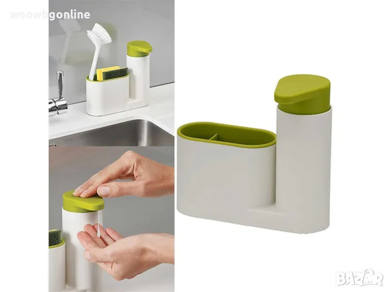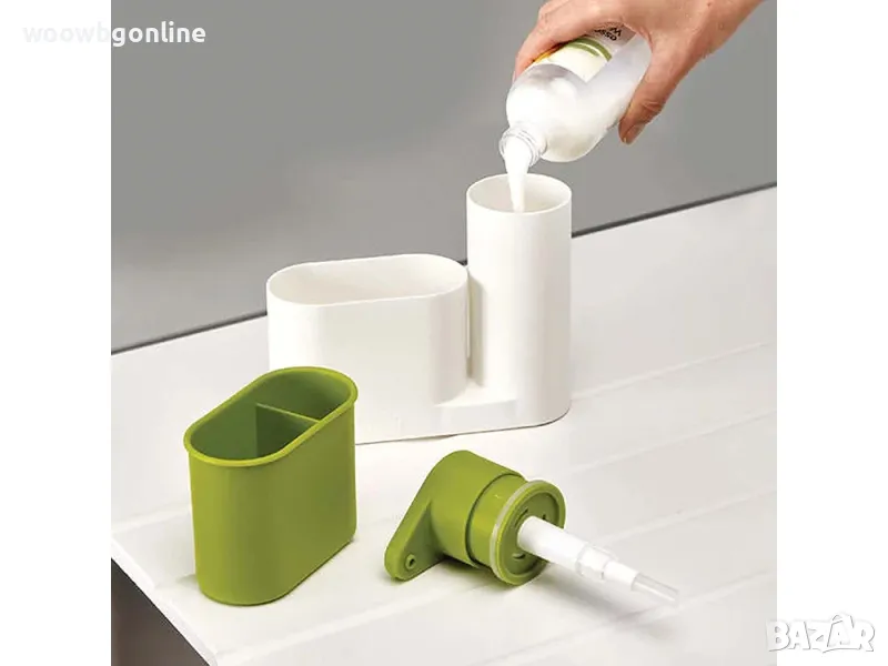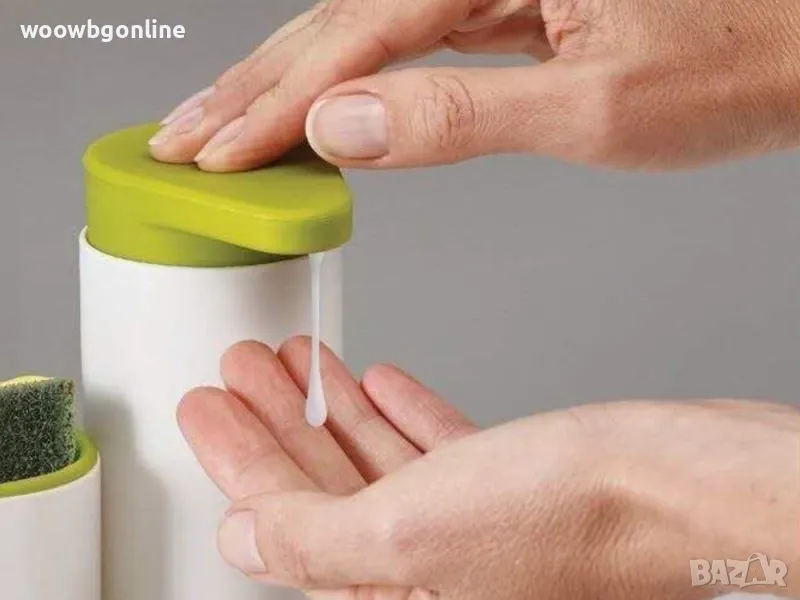 Лесна за използване помпа ще ви помогне да дозирате точното количество течност. Самият контейнер може да побере четка за миене на съдове, гъби или четки за зъби с паста за зъби.
