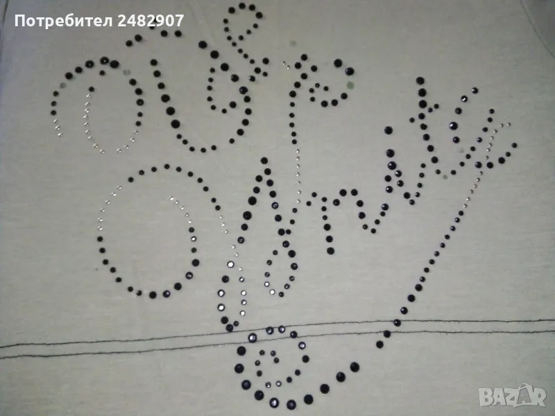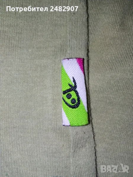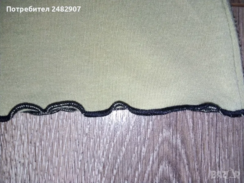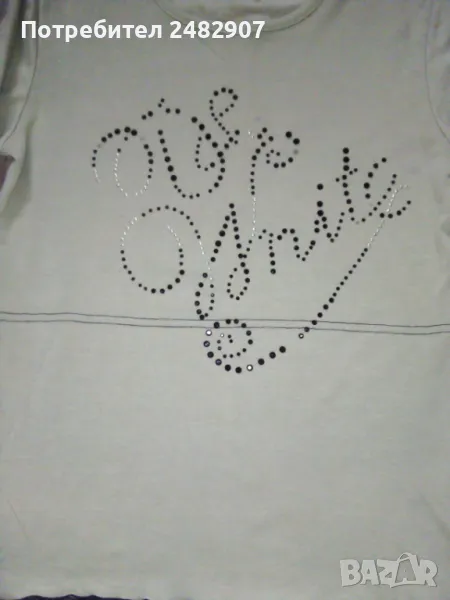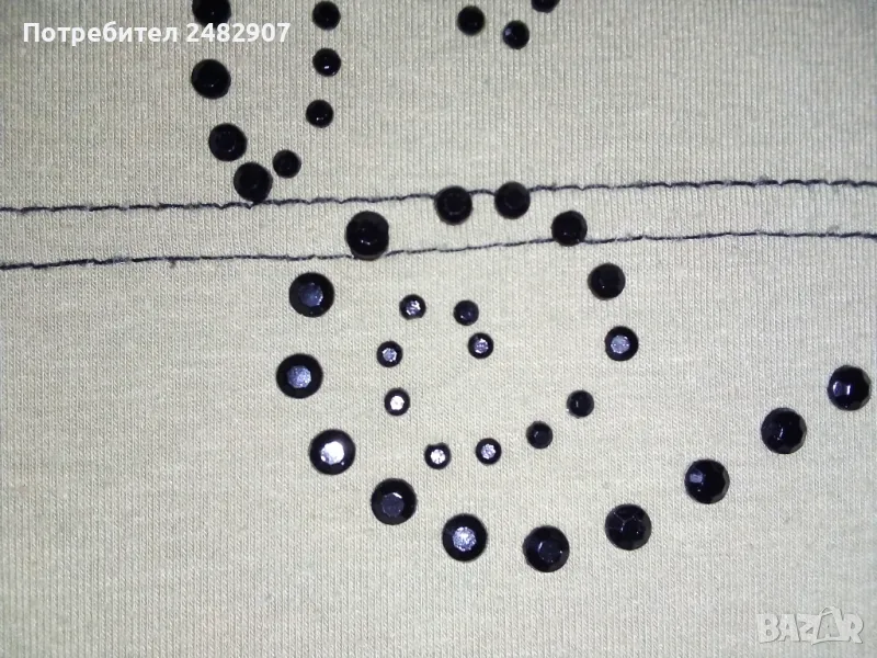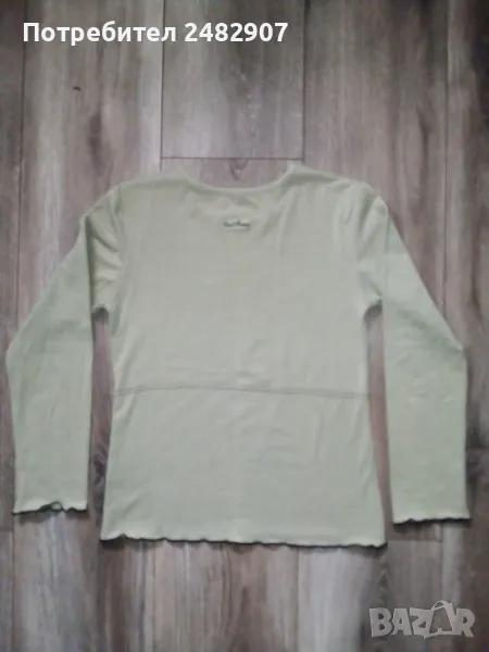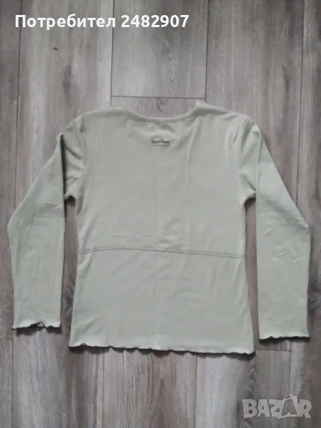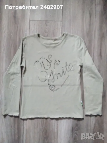 Детска блуза за момиче в маслено зелен цвят и блестящи камъчета отпред. Съдържа 100 % памук. Ширина в раменете - 34 см, ширина под мишниците - 38 см, ширина в долната част - 39 см, дължина от рамото до долу - 51 см, дължина на ръкава от рамото - 49 см, ширина на ръкава в долната част - 10 см. Много запазена, почти не е използвана, без забележки.