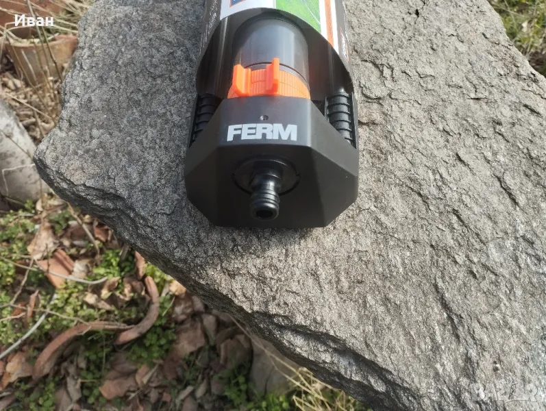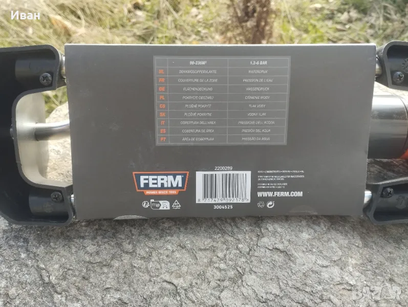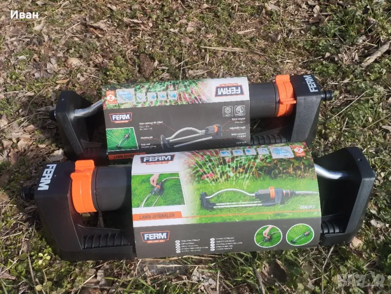 Градинска пръскачка Ferm .Разпръсквач за поливане на райграс и цветя .Може да се настройва посоката на пръскане .Максимална площ за поливане 90-236m²Налягане на водата - 1.2-6 бара .моля разгледайте и другите ми обяви.имам също и други градински принадлежности