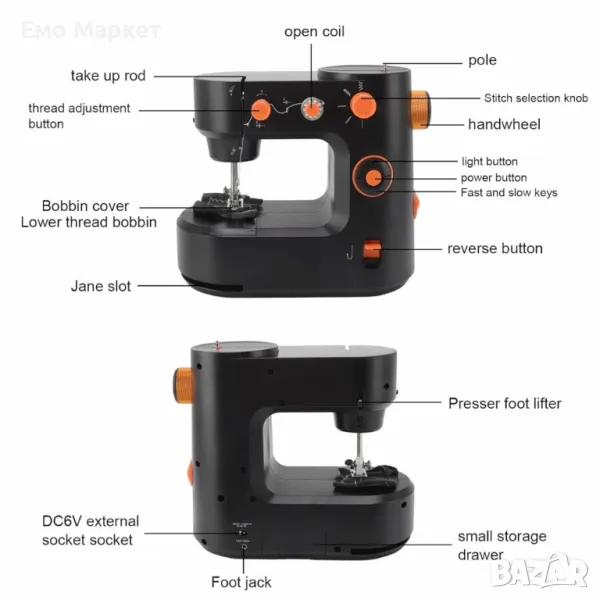 Обратно шиене, автоматично навиване, проста функция за шиене, регулируема плътност, с малко чекмедже.