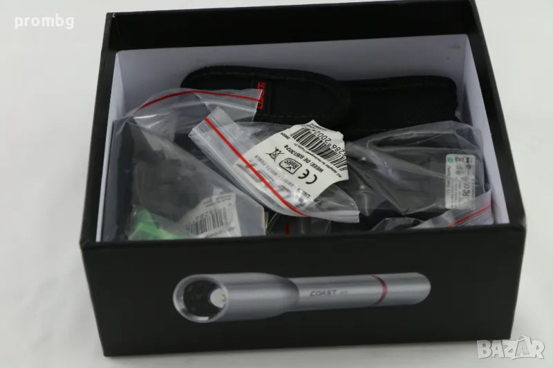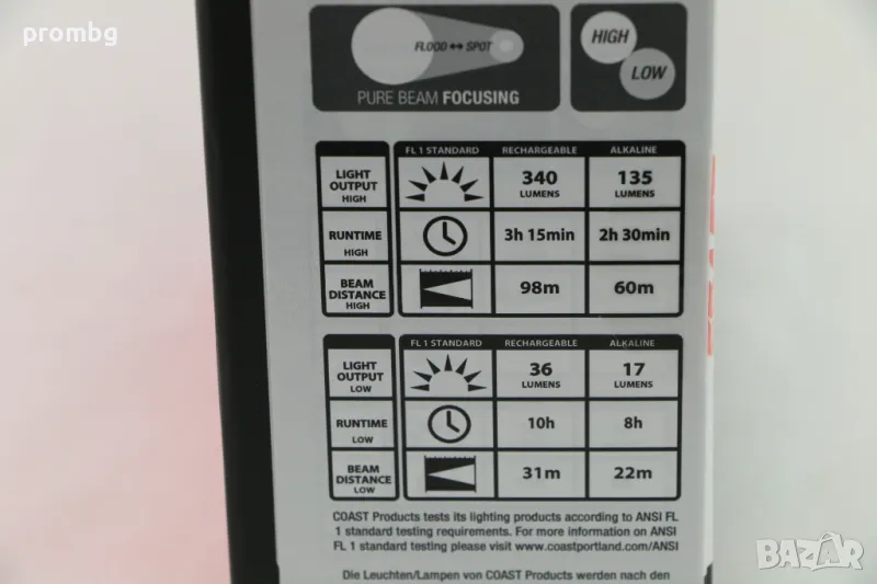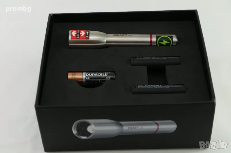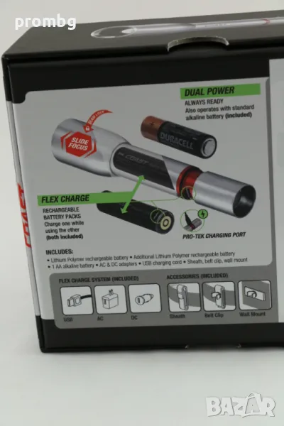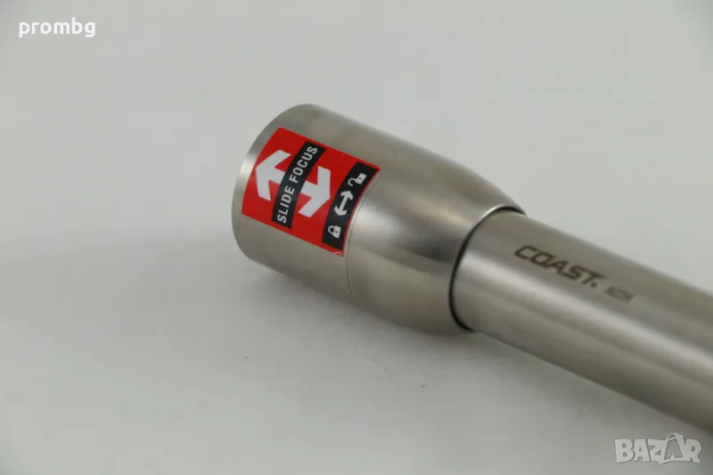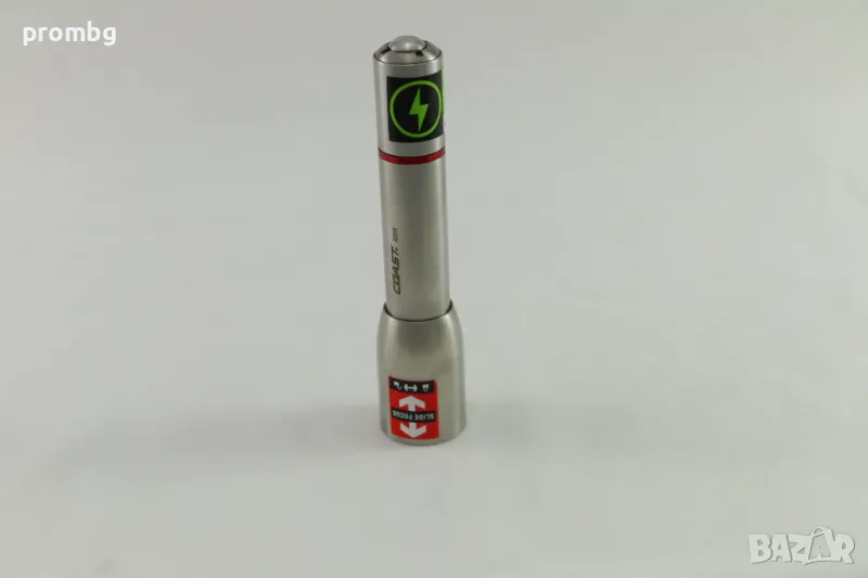 Led фенер, 340 лумена, LiPo батерия. Марка Coast-USA. Дължина 12 см, тегло 130 гр. Внос от Германия. Лесен за почистване корпус от неръждаема стомана. Променлив фокус, презареждаща батерия. Системат Flex Charge Dual Power позволява батерията да се зарежда вътре или извън фенера. Устойчив на атмосферни влияния и практически нечуплив. Тестван и класифициран. съгласно стандартите ANSI / FL1. Интензитетът на светлината при силен режим е340 лумена, при слаб режим - 36 лумена. Дължината на светлинния лъч при силен режим е 321 FT / 98 м, при слаб режим - 101 FT / 31 M. Време на светене в силен режим 3ч и 15 мин, в слаб режим 10 ч. Работи с 2 х АА. батерии LiPo и 1 х АА алкална батерия.
