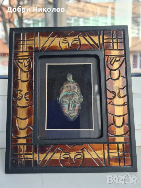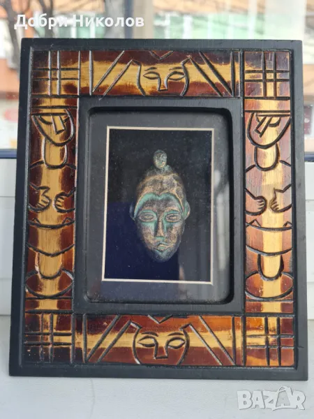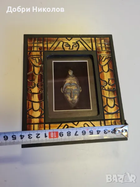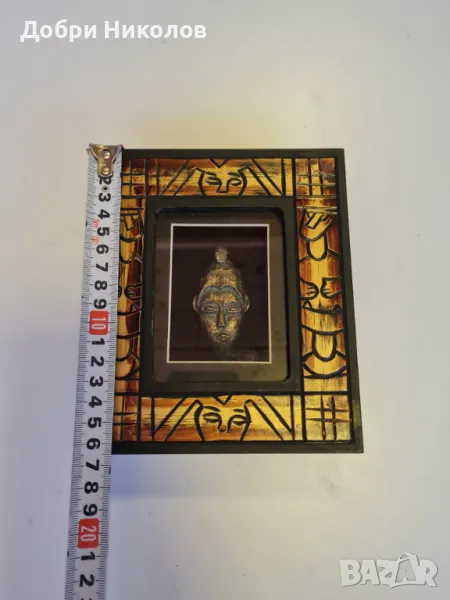 Красиво африканско пано, уникална племенна маска Shadow Box Art African Tiki, месингова маска вътре и красиво декорирана рамка за стена отвън. Размери 14х16,5х2,5 см. Негледано, ново,