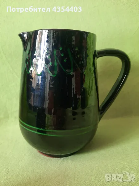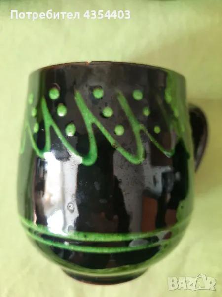 Изработен е в традиционен стил с ръчна декорация в тъмнокафяво и зелено. Ретро допълнение към всяка колекция или за любителите на винтидж посудата. Подходящ за вино.