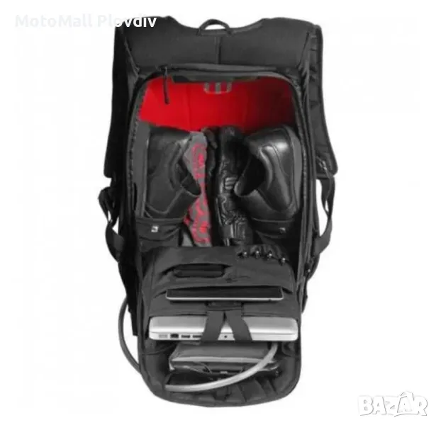 джоб за обувки. Подвижната каишка за каска освобождава ръцете ви, когато слизате от мотора, докато червеният