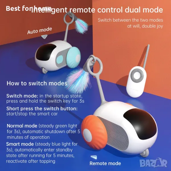 【2 лесни режима на игра】: Въртящите се на 360° RC коли разполагат с два режима за ваше удобство. В първия режим, когато играчката е включена, можете да използвате дистанционното управление, за да управлявате колата да започне да се движи и да се клати. Във втория режим просто натиснете и задръжте бутона за захранване за 3 секунди в състояние на стартиране, за да влезете в интелигентния режим. Той автоматично ще се движи и разклаща, осигурявайки безкрайно забавление за вашата котка, без да е необходимо да я управлявате чрез приложение.