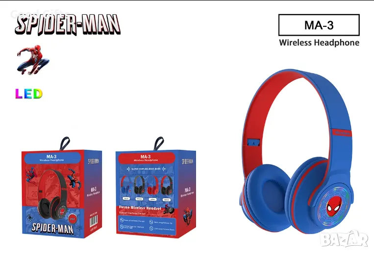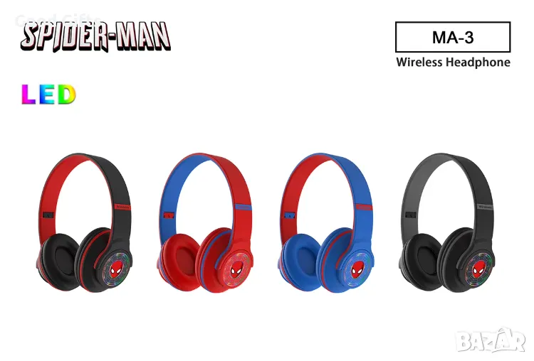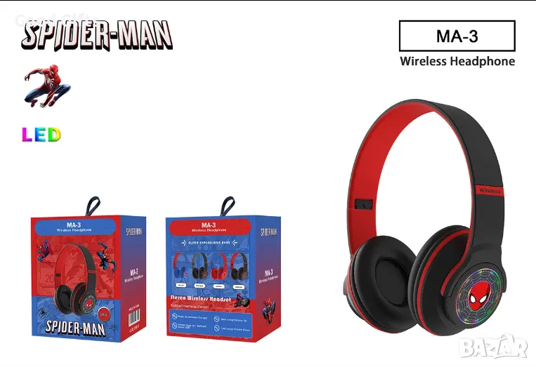 Безжични Светещи Bluetooth слушалки Спайдърмен Spiderman- сгъваеми с вграден микрофон