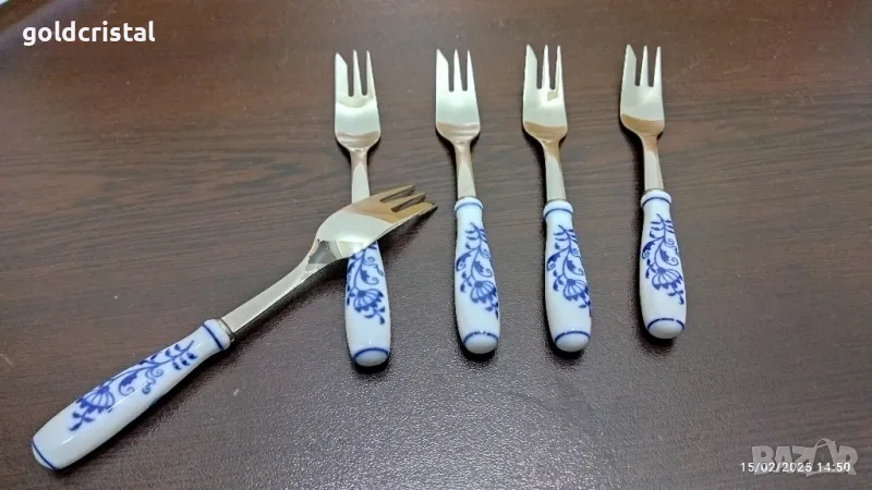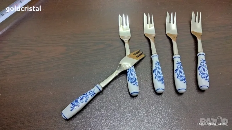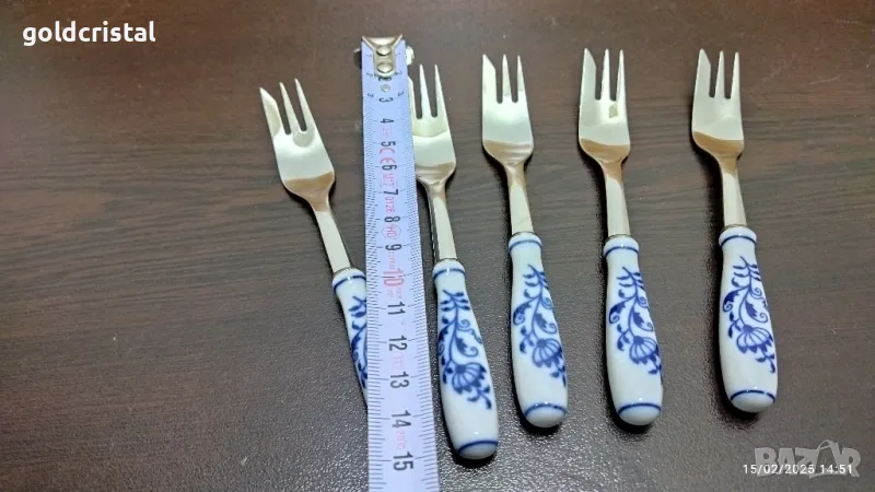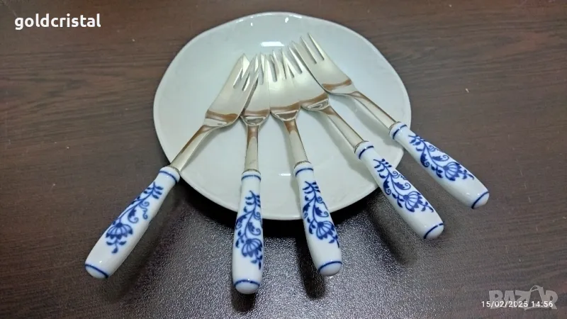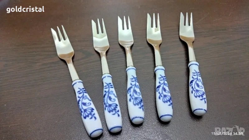 ретро немски прибори десертни 5 броя вилички неизползвани с порцеланова дръжка син лук сервиз комплект сет лот ретро арт декор винтидж колекция стари старинни антикварни предмети обзавеждане за дома и семейството подходящи за подарък за ценители и колекционери