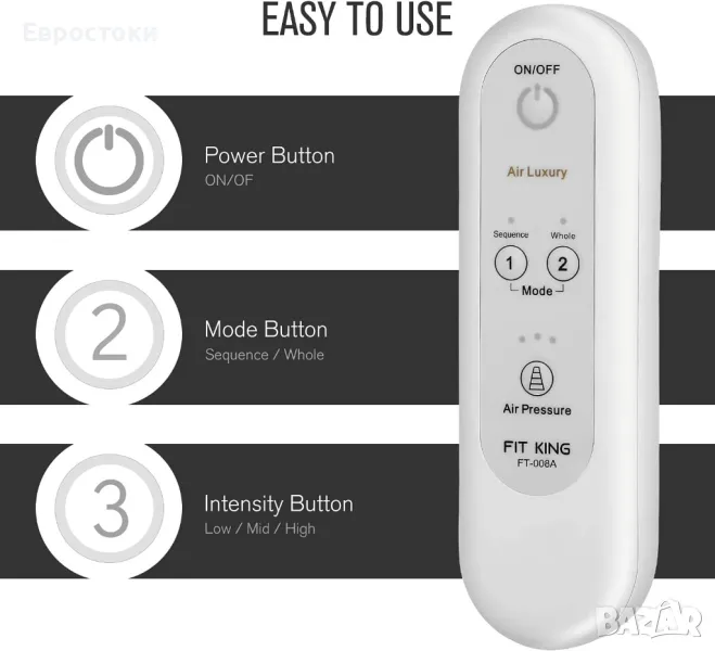 FIT KING Масажор за крака с въздушна компресия за прасци и стъпала, за релаксиращ масаж на фотьойл с ръчен контролер, 2 режима и 3 интензитета. Напълно регулируем размер. Черно