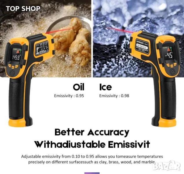 IR температурен пистолет с регулируем коефициент на излъчване - за готвене, барбекю, храна, хладилник, фурна за пица, двигател