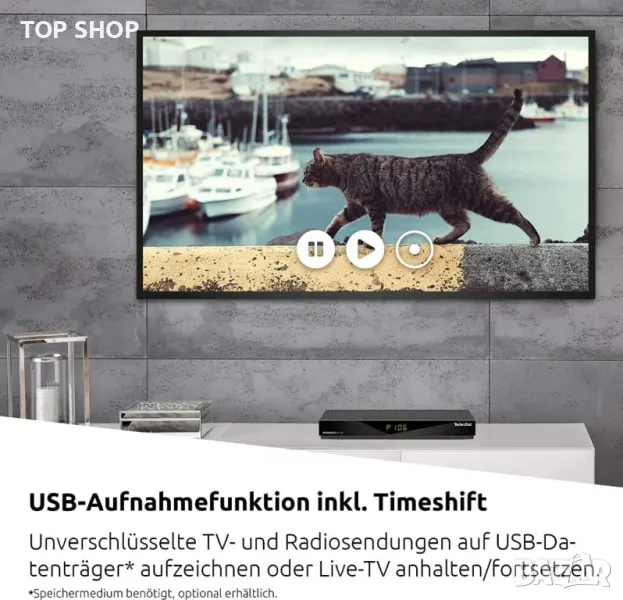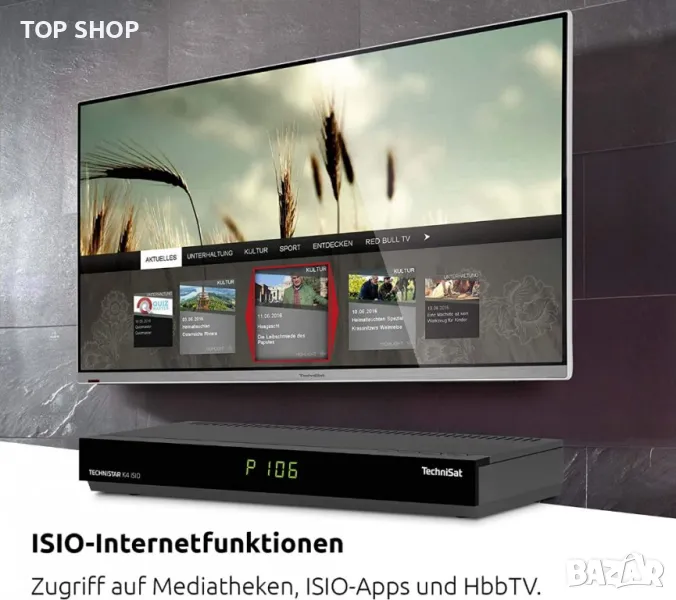 Set-top box TECHNISTAR K4 ISIO DVB-C, четворен тунер, USB запис (готов за PVR), едновременно запис/възпроизвеждане, четец на карти за Conax, CI+: 1, EPG, комфортен EPG, цифров преден дисплей, HbbTV-активиран, възпроизвеждане на интернет радио , Интернет достъп до онлайн услуги, OSD многоезичен, 4000 програмни слота, вграден телетекст, аудио чинч изход, цифров изход коаксиален, мрежова връзка (Ethernet), скорост на трансфер на данни Ethernet максимум 100 MBit/s, HDMI връзка, Scart връзки: 1 , USB връзка, управление чрез приложение, приложение TechniSat CONNECT, управление