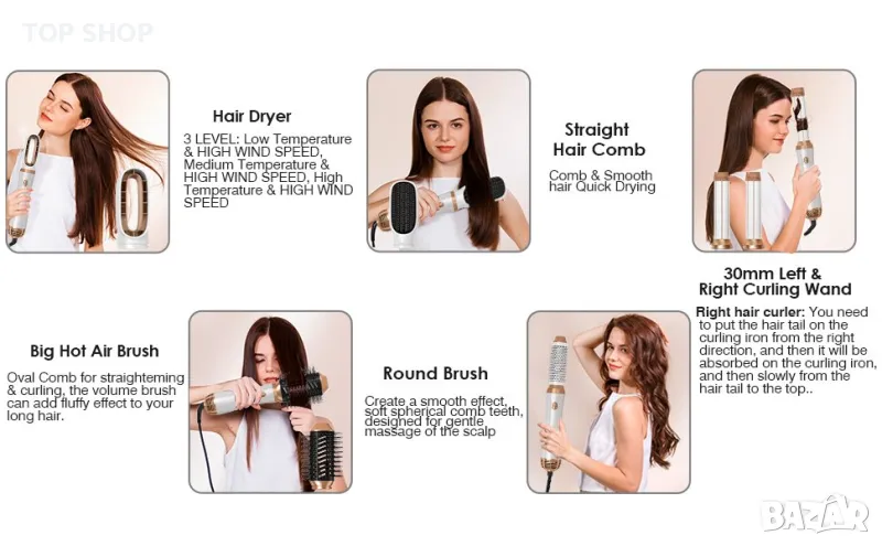· Този многофункционален комплект сешоар за пътуване включва 6 стилизиращи аксесоара, които могат да направят косата къдрава, гладка, суха, изправена и вълнообразна.