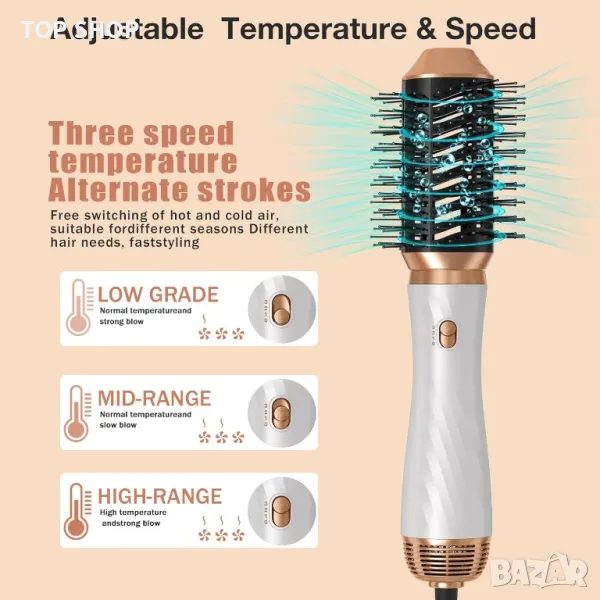 【3 настройки на температурата】 ➤ 1: Ниска температура, ВИСОКА СКОРОСТ НА ВЯТЪРА, за суха коса/фина коса, Подходящо за лятна употреба. ➤ 2: Средна температура, ВИСОКА СКОРОСТ НА ВЯТЪРА, за полусуха коса / нормална коса, Подходящо за оформяне. ➤ 3: Висока температура, ВИСОКА СКОРОСТ НА ВЯТЪРА за мокра коса / гъста и къдрава коса, Подходящо за зимна употреба, изсушава косата бързо. Контролът на температурата ви позволява да изберете най-подходящия за вашия тип коса.
