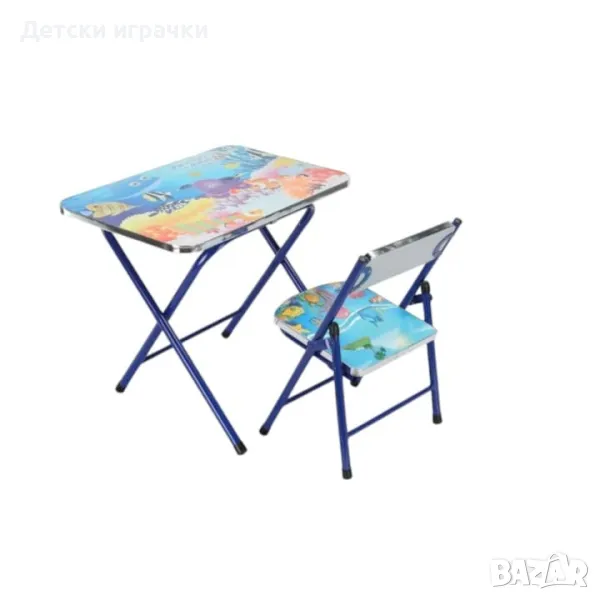 Масата с детското столче са идеални за детската стая, изработени са от дърво, а краката са метални и предлагат възможност за регулиране на височината.
