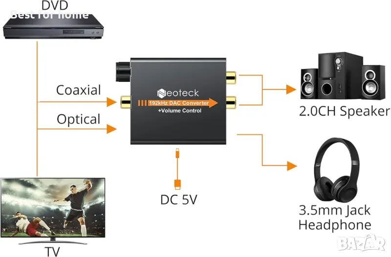 【2-канален LPCM или PCM】Поддържа некомпресиран 2-канален LPCM или PCM изходен цифров аудио сигнал; Осигурява предаване без електромагнитен шум (този DAC адаптер поддържа само 2.1 канал, не за 5.1 канал и DTS; ако имате нужда от актуализирана версия, просто потърсете Asin: B01MXJ83G4)