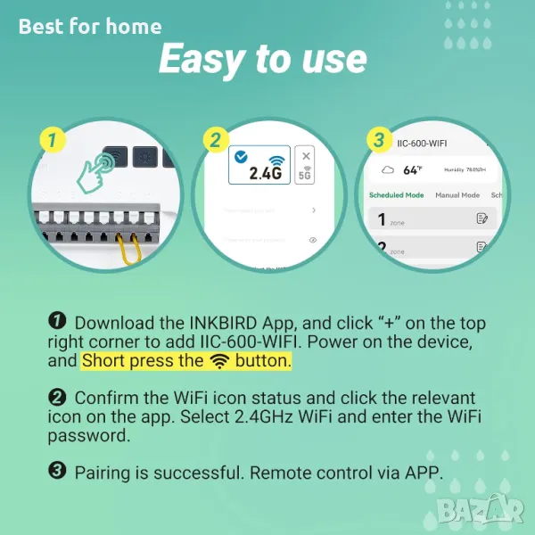 WiFi Remote: IIC-600-WIFI интелигентен спринклерен контролер има вграден 2.4G WiFi модул. Можете да зададете графика за поливане и да наблюдавате процеса на поливане в приложението INKBIRD. Съвместимост с APP--iOS 11.0+ и Android 5.0+. Забележка: Ако вашият рутер е двубандов, моля, активирайте независимо 2,4 GHz WiFi лента и я наименувайте различно от 5 GHz WiFi лента.
