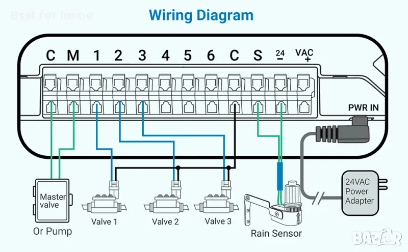 Сензор за дъжд и сезонна настройка: Този контролер за напояване поддържа сензор за дъжд, което го прави способен да пропуска графиците за поливане в дъждовни дни, за да предотврати преполиване. Той поддържа сезонна настройка, която ви позволява ръчно да регулирате времето за поливане на всички зони с един бутон при смяна на сезоните. И двете са проектирани да пестят вода и да осигурят гъвкавост при напояване на градината.