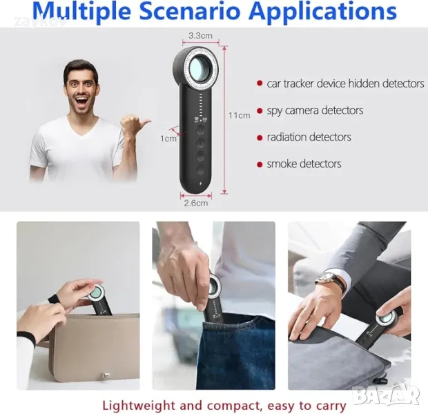 Широка съвместимост: Открива скрити камери, GPS тракери, RF предаватели на бъгове и подслушващи устройства, осигурявайки пълна сигурност в различни среди, гарантира, че в голямо разнообразие от места като домове, хотелски стаи, частни спални, места за настаняване, съблекални, бани, офиси и конферентни зали, спокойствие, където и да сте