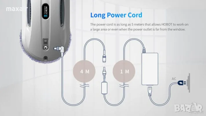 Hobot работи единствено, свързан с ел. мрежата. Поради тази причина разполага с достатъчно дълъг кабел – 5м. Ако това не Ви достига, винаги можете да си вземете още един кабел за удължаване.