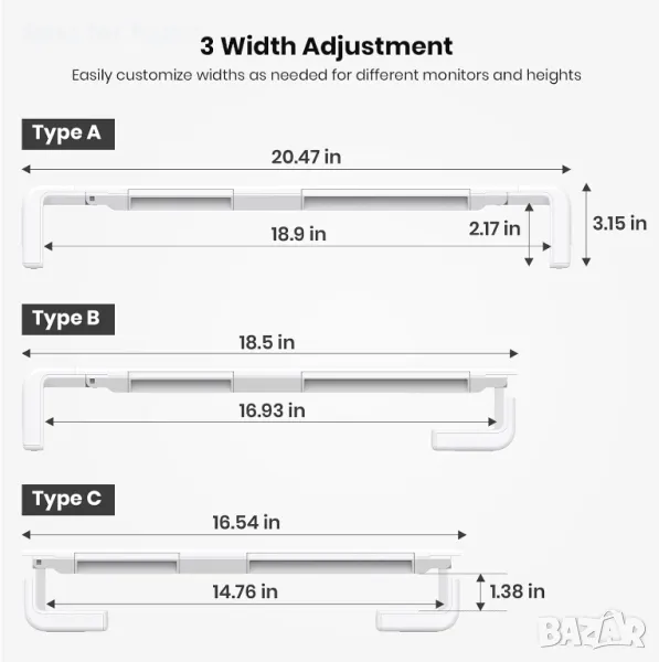 【Регулируема и сгъваема стойка за компютър с 3 дължини】Поставката за стойка за монитор Klearlook предлага 3 регулируеми ширини - 16,5 инча, 18,5 инча и 20,5 инча, като лесно пасва на различни работни станции. Стойката за настолен монитор Klearlook прави допълнителното пространство отдолу подходящо за вашата пълноразмерна механична клавиатура, когато приключите работата си. Ширината между 2 крака е 18,09 инча, след като го разгънете напълно.