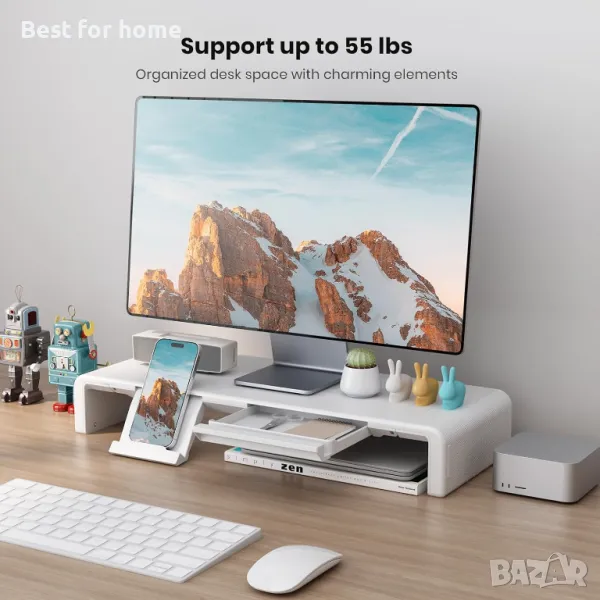 【Многофункционална поставка за бюро】 Тази поставка за монитор е оборудвана със скрита вградена поставка за таблет/телефон и чекмедже за съхранение. Всичките ви необходими електронни устройства и основни неща за офиса са перфектно организирани за лесно разглеждане и достигане.