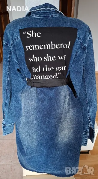 Дънкова рокля на Stela. Може да се носи свободно или вселена с колан. Размерът е подходящ за М и L. Дължина 99см, от рамо до рамо 56, бюст62, талията 61, ханш62.