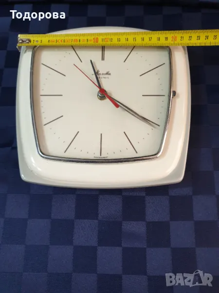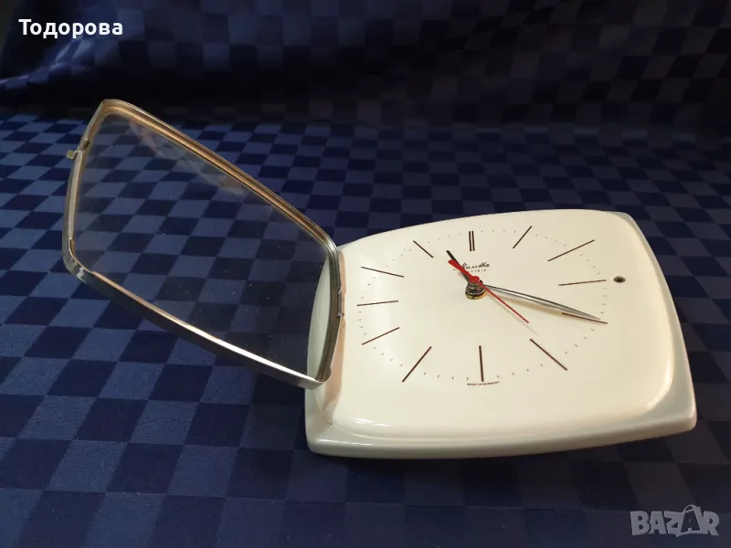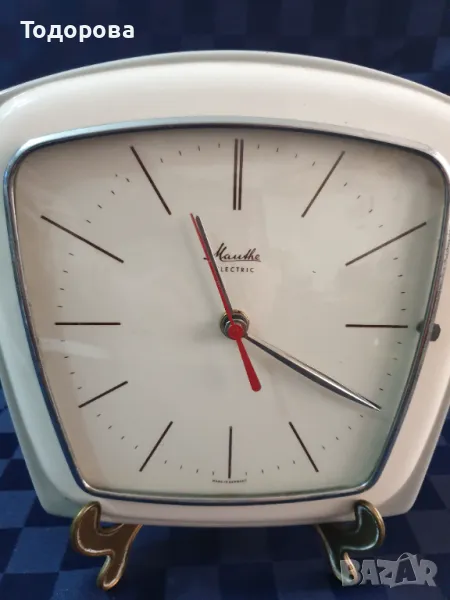 Порцеланов кабинетен трапецовиден часовник Mauthe.С трапецовидно изпъкнало защитно стъкло.Работещ отлично. Размер - 22 х 22 см.
