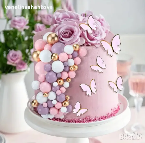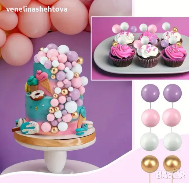 Комплект от 108 броя топчета на тел от стиропор за декорация на торта в бял, розов, златист и лилав цвят.