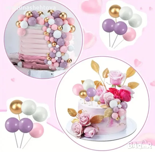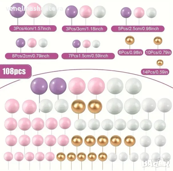 108 броя топчета топки на тел от стиропор за декорация на торта бели златисти розови лилави → Обява 49152273