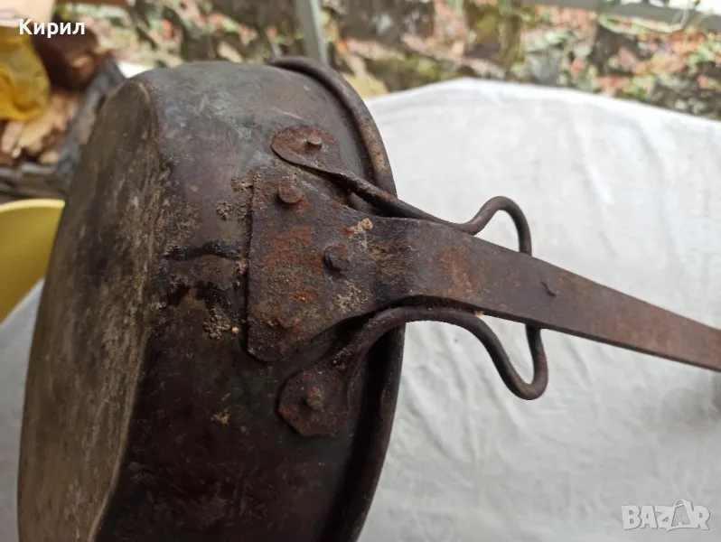 Продавам старинна медна тава с желязна дръжка.